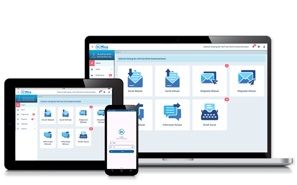 inOffice membantu instansi untuk mendigitalkan proses surat-menyurat. Aplikasi inOffice mempermudah proses drafting surat, pelacakan status surat, pencarian surat dengan cepat, dan penyimpanan arsip digital yang aman, sehingga meningkatkan efisiensi kerja serta memastikan keamanan informasi di setiap tahap pengelolaan surat.